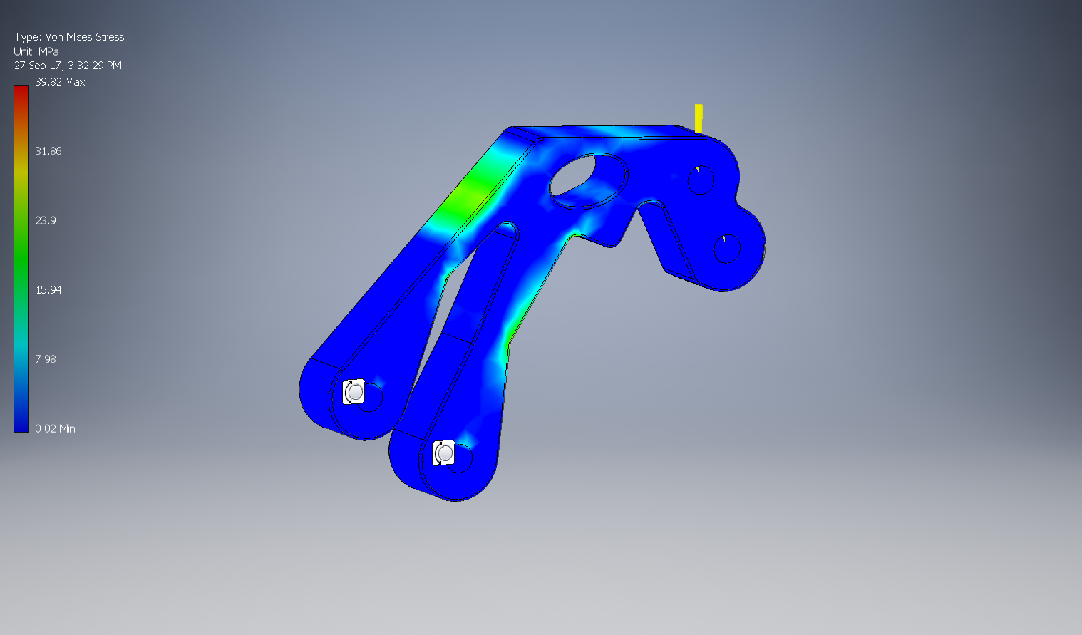Whilst quite odd in shape and definitely not the intuitive solution. The peak stress is now 30MPa. A reduction of 50%. The mass of the bracket has also been reduced by 20%. For similar manufacturing approach the client saved on raw material cost and improved fatigue life by several orders of magnitude.